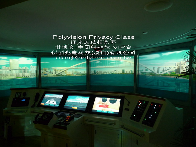 中国船舶馆是最受欢迎的世博会场馆之一,集中展示了中国船舶业的发展历程,是广大船舶粉丝必到的场馆。中国船舶馆VIP室里的模拟驾驶投影,给参观游览的贵宾们留下深刻的印象。五块硕大的Polyvision Privacy Glass电控调光玻璃,构成一个圆弧的视窗,加之玻璃前面的控制台,看起来像是一个专业的船舶驾驶室。更妙的是,Polyvision Privacy Glass电控调光玻璃上背投轮船在行进的高清晰画面,画面中水在流动,配合悦耳的背景音乐,现场感十足,给人一种如临船中的错觉,非常震撼。